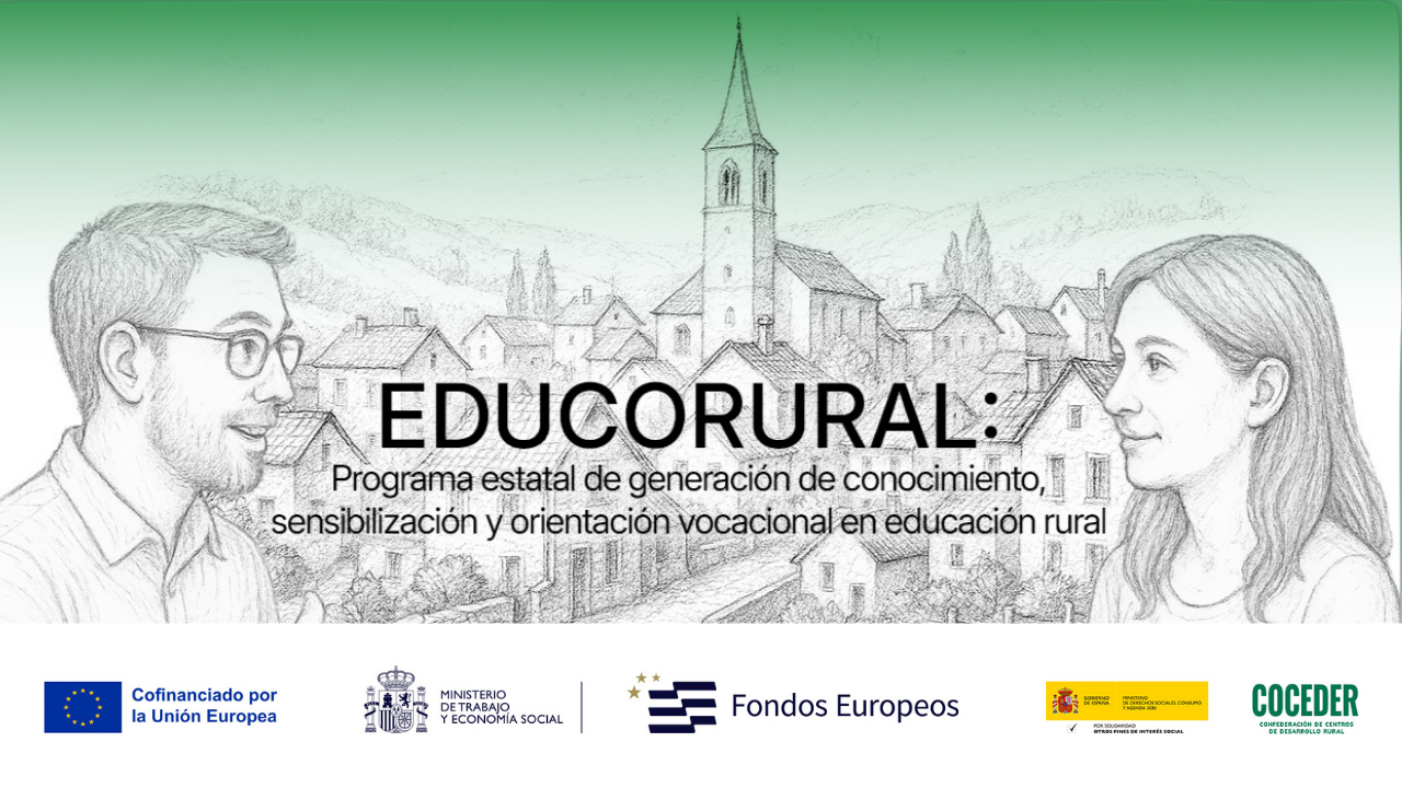 Esta iniciativa se enmarca en el programa “EDUCORURAL: PROGRAMA ESTATAL DE GENERACIÓN DE CONOCIMIENTO, SENSIBILIZACIÓN Y ORIENTACIÓN VOCACIONAL EN EDUCACIÓN RURAL” está financiado por el Ministerio de Derechos Sociales, Consumo y Agenda 2030 para la realización de actividades de interés general con cargo a la asignación tributaria del Impuesto sobre la Renta de las Personas Físicas y cofinanciado en el marco del Programa de Inclusión Social, Garantía Infantil y Lucha contra la Pobreza, por la Unión Europea CCI 2021ES05SFPR003 en la operación “Itinerarios Integrales frente la despoblación en Inclusión Social”.