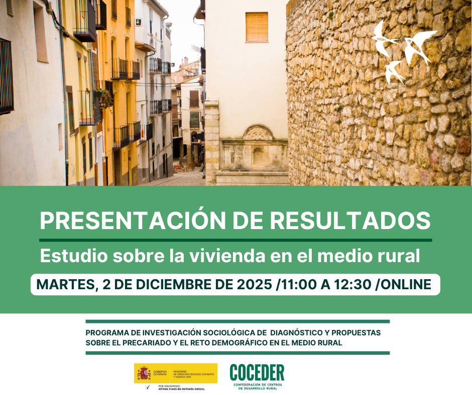 La Confederación de Centros de Desarrollo Rural (COCEDER) abre las inscripciones para la jornada online de presentación de resultados de un estudio que hemos desarrollado sobre la vivienda en el medio rural.