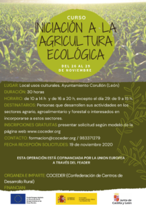 El curso de “Iniciación a la agricultura ecológica” tendrá lugar unos días más tarde, del 26 al 29 de noviembre en el mismo local de usos culturales del Ayuntamiento de Corullón. Además de iniciarse en la agricultura ecológica, en la producción de alimentos más sanos y respetuosos con el medio ambiente, y de conocer los principios de esta práctica agrícola, esta formación enseñará el concepto de fertilidad y la forma de aplicarlo para la obtención de mejores producciones y saber cómo prescindir de la utilización de abonos químicos y plaguicidas, conociendo el control biológico de plagas y enfermedades. También tiene como objetivos saber diseñar una explotación ecológica e iniciarse en los principios de la agrohomeopatía.