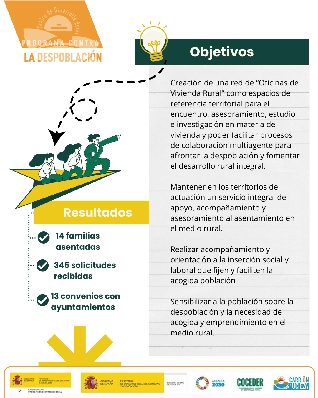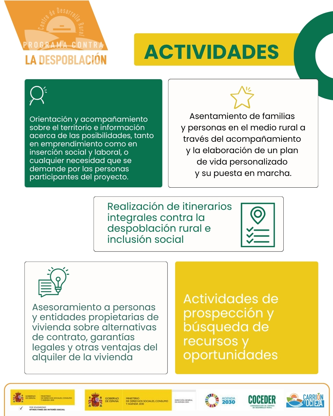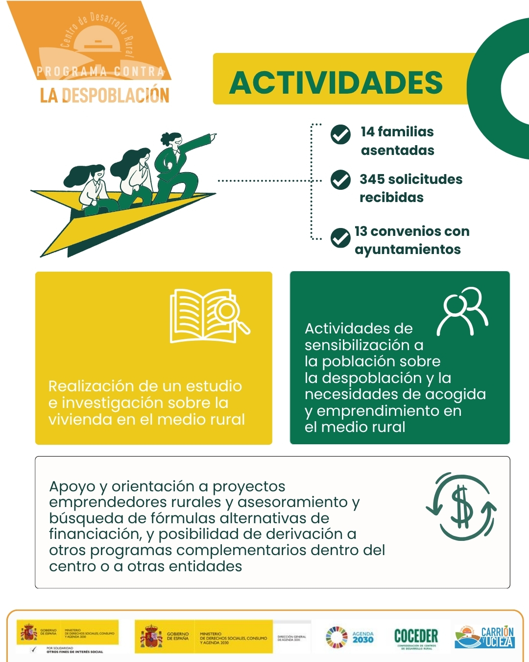 El programa de sensibilización y concienciación sobre la despoblación y la necesidad de emprendimiento rural en el medio rural, impulsado por Coceder, está financiado por el Ministerio de Derechos Sociales, Consumo y Agenda 2030, dentro de los programas de interés social, con cargo a la asignación tributaria del 0,7% del IRPF y el programa vivienda rural, proyectos piloto para su liberación y rehabilitación está financiado por el Ministerio de Derechos Sociales, Consumo y Agenda 2030 para la realización de actividades relacionadas con la promoción e implementación de la Agenda 2030 para el Desarrollo Sostenible de España.