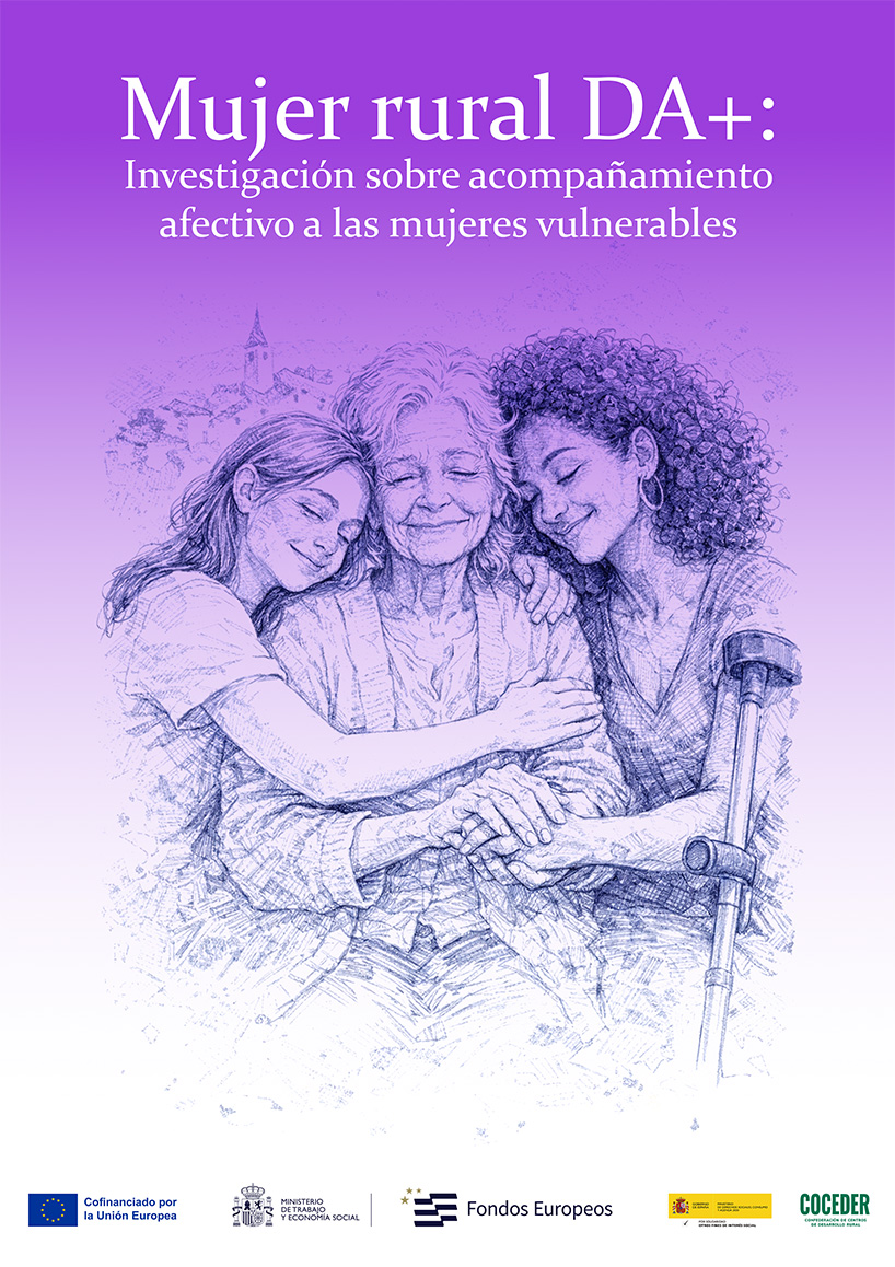 “Mujer Rural DA+: INVESTIGACIÓN sobre Acompañamiento afectivo a las mujeres vulnerables del medio rural” está financiado por el Ministerio de Derechos Sociales, Consumo y Agenda 2030 para la realización de Actividades de interés General con cargo a la Asignación Tributaria del Impuesto sobre la Renta de las Personas Físicas y cofinanciado en el marco del Programa de Inclusión Social, Garantía Infantil y Lucha contra la Pobreza, POR LA UNIÓN EUROPEA CCI 2021ES05SFPR003 en la operación “COMUNIDADES INCLUSIVAS: SOLUCIONES INNOVADORAS DE CUIDADO Y APOYO EN EL MEDIO RURAL”.