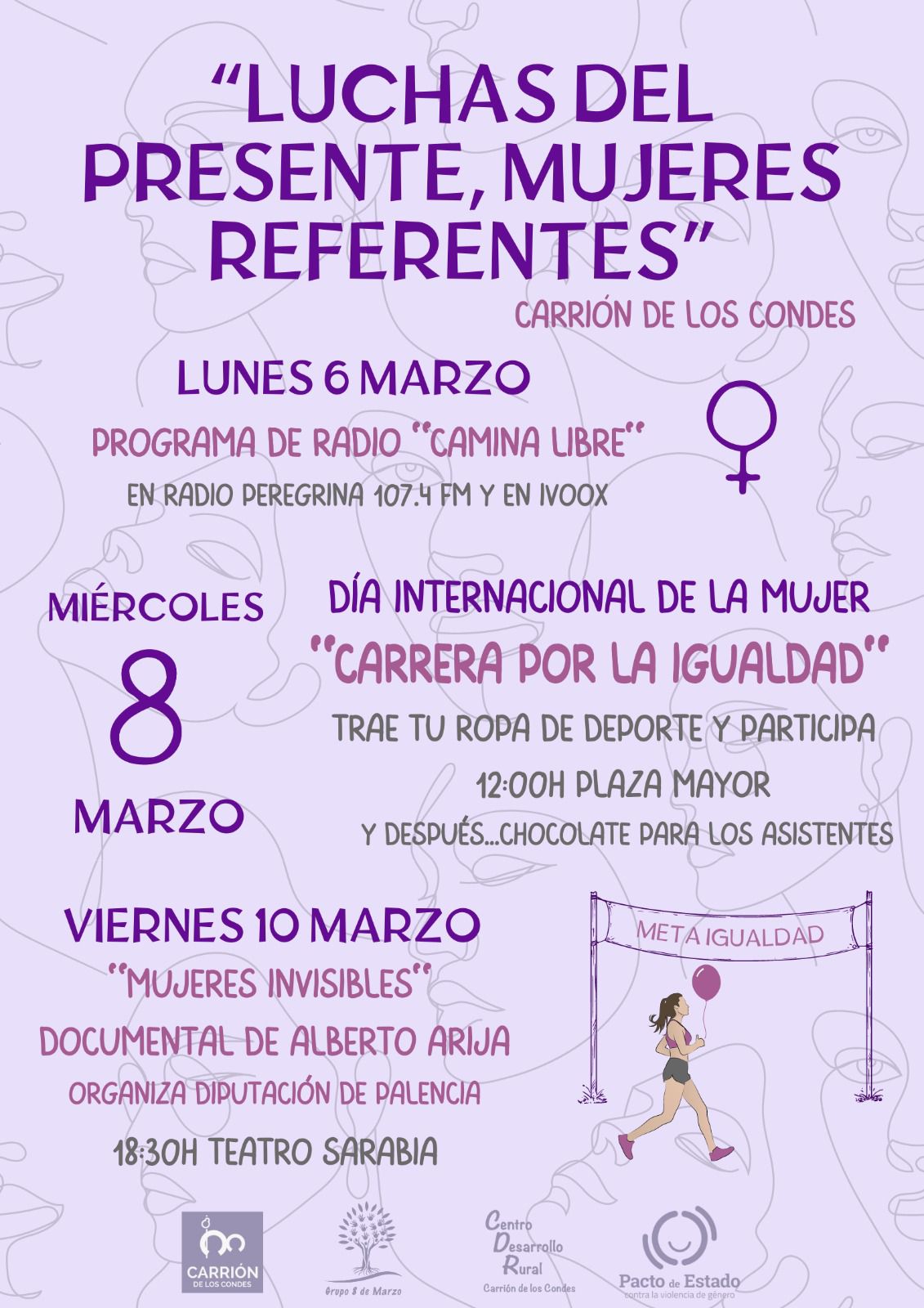 El CDR Carrión de los Condes, como parte del Grupo 8 de Marzo, en el que además forma parte el ayuntamiento de esta localidad y personas a título individual, han escogido el lema «Luchas del presente. Mujeres referentes«, con lo que pretenden reivindicar los retos a los que se enfrenta el colectivo feminista, al mismo tiempo que visibilizar nuevas mujeres referentes que a día de hoy están contribuyendo a la lucha por la igualdad desde diferentes ámbitos.
