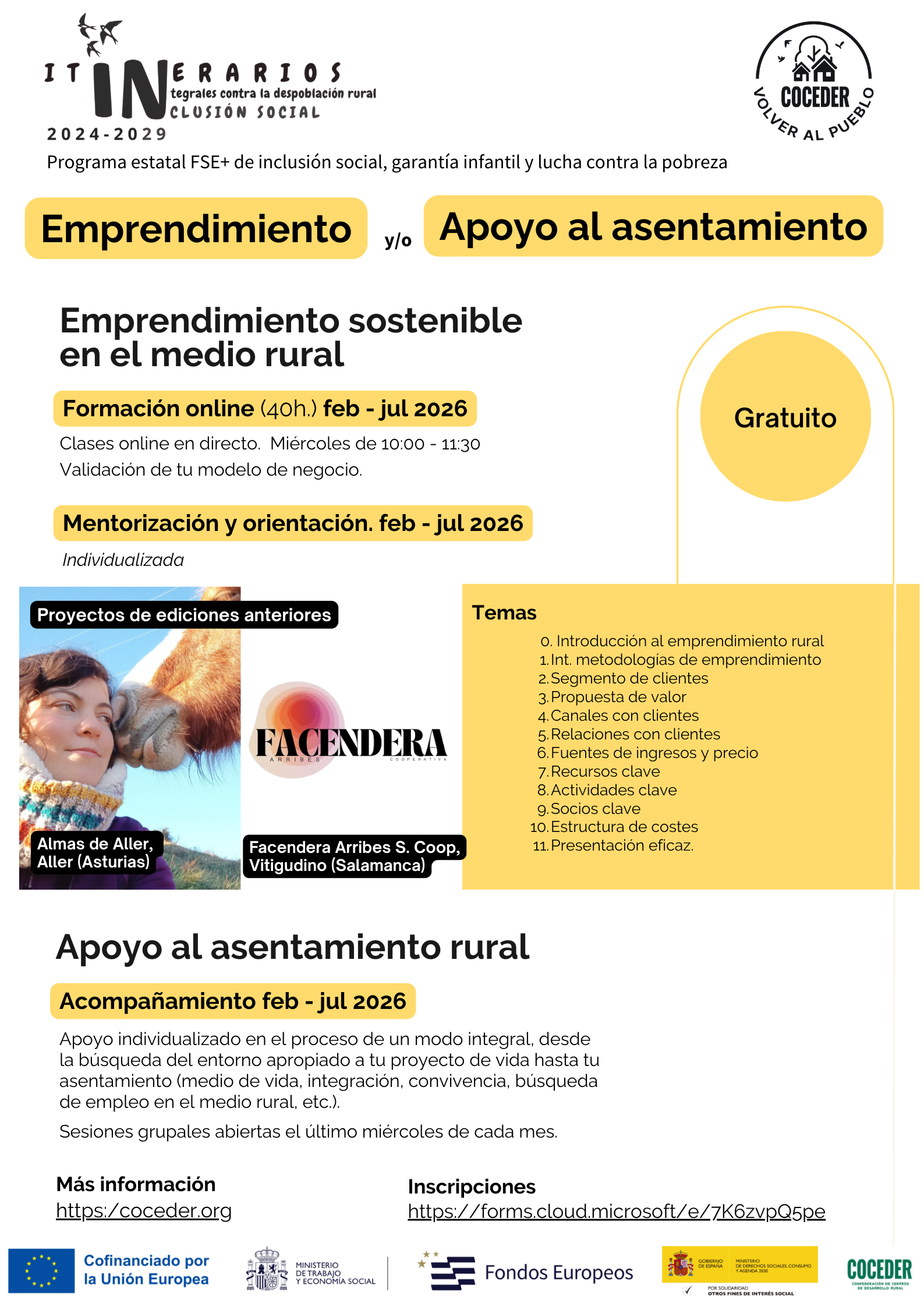 Este itinerario de emprendimiento sostenible y/o asentamiento en el medio rural se desarrollará del 11 de febrero al 30 de julio, es gratuito y se enmarca dentro del programa estatal FSE+ de inclusión social, garantía infantil y lucha contra la pobreza (2021es05sfpr003) cofinanciado por la Unión Europea y el Ministerio de Derechos Sociales, Consumo y Agenda 2030, dentro de los programas de interés social con cargo a la asignación tributaria del 0,7% del IRPF.