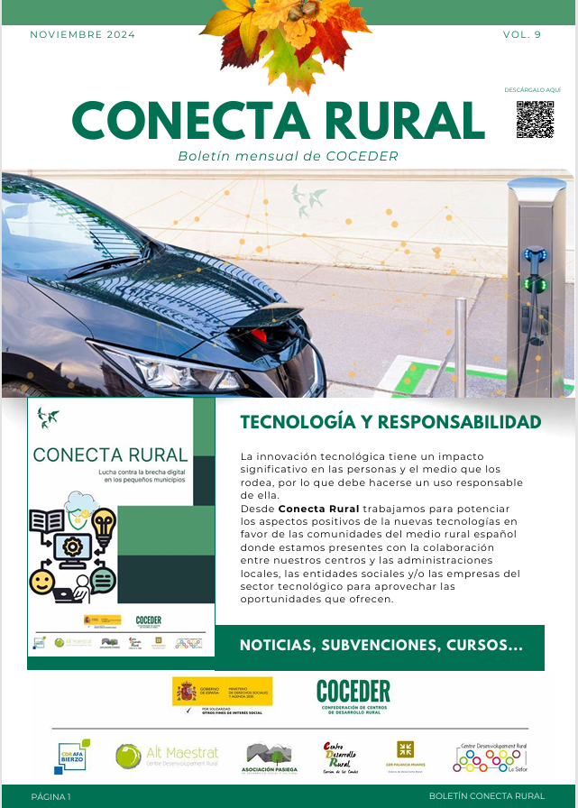 "Conecta rural, lucha contra la brecha digital en los pequeños municipios", está subvencionado por el Ministerio de Derechos Sociales, Consumo y Agenda 2030, dentro de los programas de interés social, está coordinado por COCEDER y lo llevan a cabo los centros de desarrollo social asociados AFA Bierzo, Alt Maestrat, Carrión de los Condes, Palancia Mijares, Asociación Pasiega y La Safor.